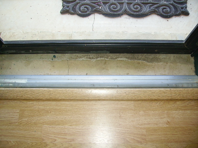 Before going indoors, I notice the threshold is rather dirty. Using warm, soapy water and a scrub brush, I work on the concrete surface and the metal parts. The rubber strip gets a careful wiping with a sponge. I wipe off as much as I can and make note of the tiny crack forming, so we can make repairs.