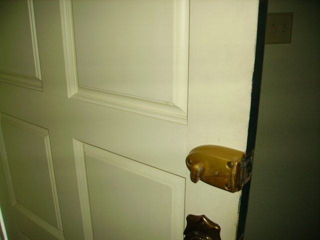 Inside, the door is not so intricate, but is a flat white, needing washing often. I note the door has not been painted correctly, needing white on the edge, instead of the green. Then I begin at the bottom, using a spray, again.
