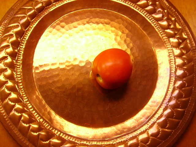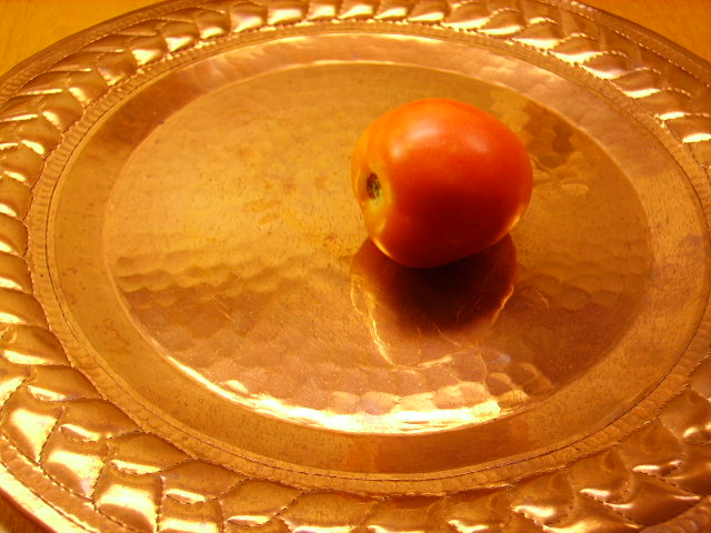 The first shot, from above, shows a tomato on a platter. The details of the platter are more noticeable for some reason, and the colors are truer to life.
